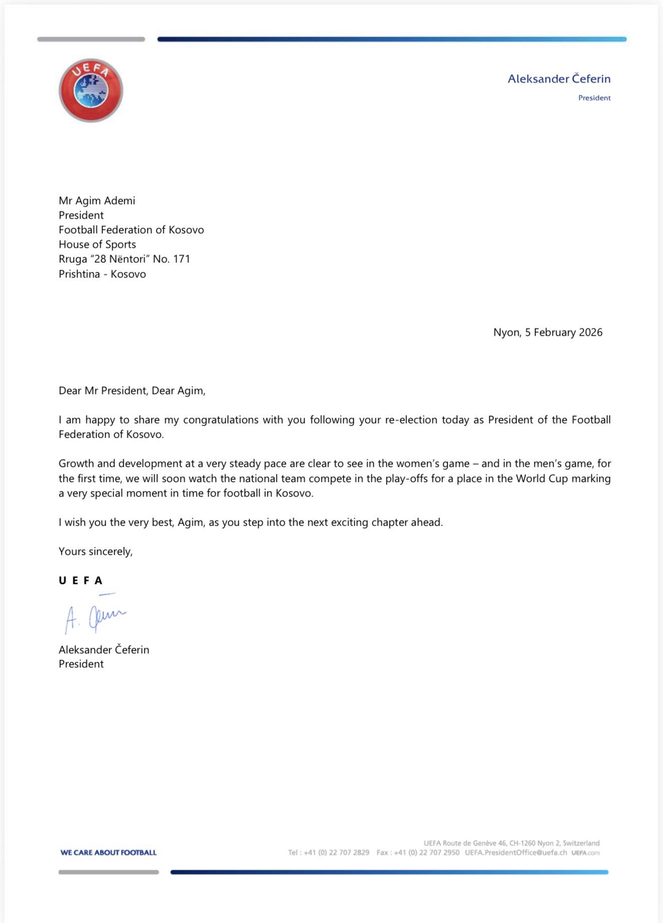 Edhe presidenti i UEFA-s, Aleksander Çeferin ka uruar presidentin Agim Ademi për rizgjedhjen në krye të FFK-së.